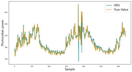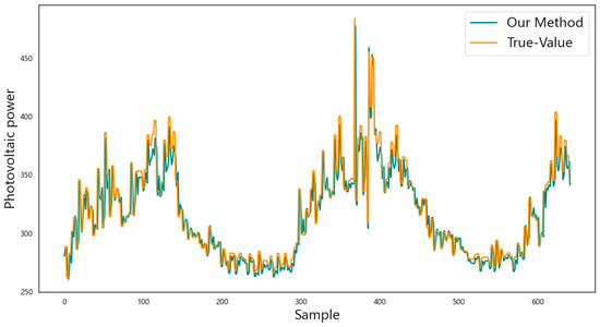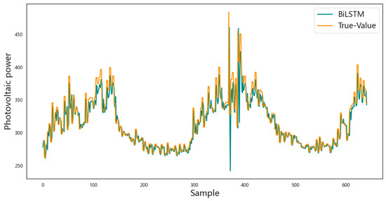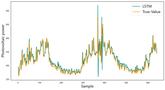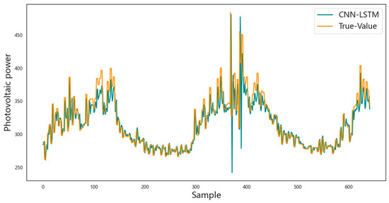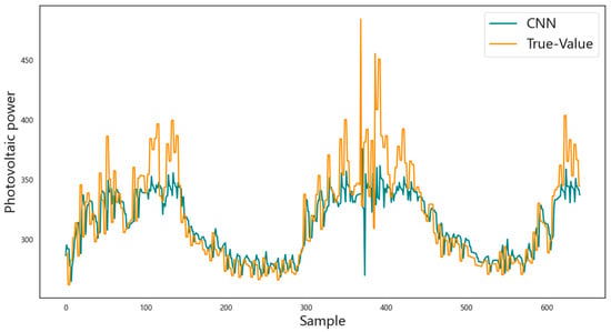 In order to further verify the superiority of the prediction model based on the long short-term memory network proposed in this paper in photovoltaic power prediction, the CNN model, GRU model, LSTM model, BiLSTM model, and CNN-LSTM model are selected as comparative models for analysis. Each comparative method is tested and analyzed based on the entire dataset, of which 70% of the data are used for training, and the remaining 30% of the data are used for prediction. The prediction results are shown in Figure 7, Figure 8, Figure 9, Figure 10, Figure 11 and Figure 12, respectively. The horizontal axis represents the sample, the vertical axis represents the photovoltaic power, the orange solid line is the actual photovoltaic power, and the blue solid line is the photovoltaic power predicted by the corresponding model. In each figure, the closer the two curves are, the better the model effect is. It can be observed that the prediction result curve of the network model proposed in this paper is closest to the curve of the actual data, and compared with the prediction results of the other five models, the prediction accuracy of the photovoltaic power of this model is higher, and the changes in the predicted value and the actual value are more consistent.