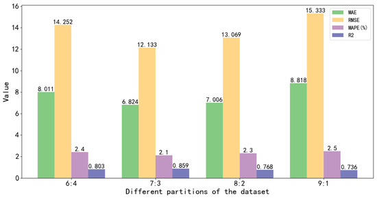 In order to further verify the robustness and reliability of the proposed model, the dataset was divided into different ratios, and the ratios of training data to test data were 6:4, 7:3, 8:2, and 9:1. Figure 13 shows the performance indicators of the proposed model on different divided datasets.