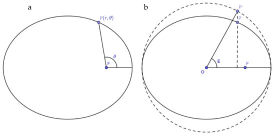 As can be seen from Figure 1b, it is trivial to obtain the following expression, which gives the formula for E (the eccentric anomaly), appearing in Equation (3) as a function of the polar coordinates with the center in the focus F. In what follows, we set the major semi-axis equal to one ():