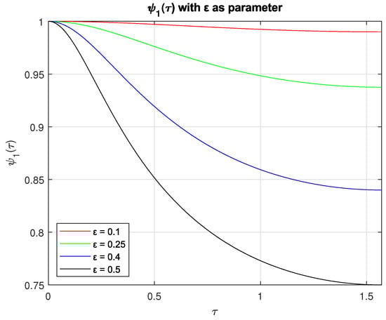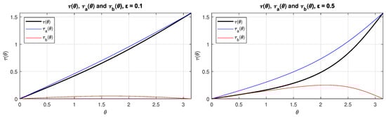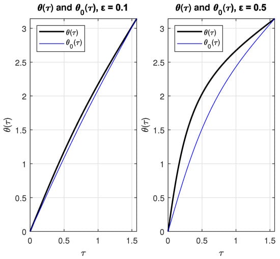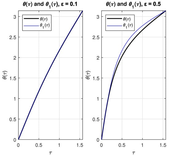 Step 2: Assuming the exact solution has the form of Equation (14), we introduce the true argument of the arctangent function, , which gives the exact solution. Then, we introduce the function (Equation (17)) as the quotient of the true argument and the argument of the zeroth approximation, . Finally, we define the first approximation by adjusting the argument of the arctangent function, which appears in the zeroth approximation . The main idea is to make a series of adjustments in such a way that the quotient mentioned above approaches 1 as closely as possible.