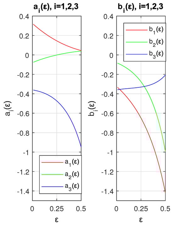 Figure 6 shows the behavior of and in the range of ∈ (0, 0.5) (this range was selected because some absolute values of and grow drastically after , which does not allow us to appreciate the behavior before ).