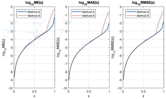 Figure 7 shows a comparison of the errors between methods A and B. As can be seen, the error in Method B was slightly higher (especially for ME) up to values of . For values of , the errors of Method B increased significantly with respect to those of Method A.