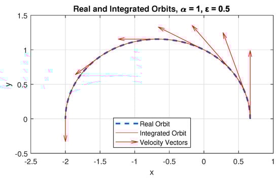 Figure 8 shows a comparison plot between the real orbit, calculated numerically using Equation (7), and the orbit obtained by numerical integration of Equation (37) (where Method A was used). Additionally, the velocity vectors are shown at an arbitrary scale at certain points of the trajectory.