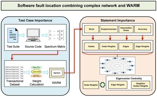 The association rule mining (ARM) algorithm is dedicated to exploring the correlation between variables hidden in a large amount of data, and the complex network theory is applied to express the characteristics and relationships of variables in complex systems. Therefore, the integration of ARM and complex network theory is appropriate, and existing studies [27,28,29,30] also show the application effectiveness of the combination of these two techniques. Under this motivation, we propose FL-WARMCN, and the overall research framework is shown in Figure 1. This method first considers the importance of test cases and adopts Jaccard to assign different weights to different transactions (test cases); then, we apply the WARM algorithm to mine association relationships (association rules) between statements. After FL-WARMCN obtains all the association rules, it takes the items (antecedents and consequents) in association rules as the nodes of the complex networks, the suspiciousness as the node weight, the association rules as the edge, and the Accuracy as the edge weight to construct an undirected weighted network. Finally, the eigenvector centrality is applied to express the importance of statements and used as a weight to calculate the suspiciousness of statements. The calculation results are sorted in descending order as the result of fault statements.