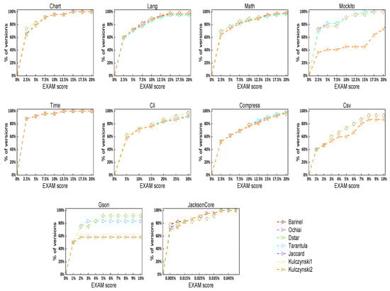 Experimental comparison results of EXAM scores using Barinel, Ochiai, Dstar, Tarantula, Jaccard, Kulczynski1, and Kulczynski2 as suspiciousness in FL-WARMCN on 10 datasets.