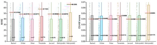 Experimental comparison results of MWE and EXAM scores using Barinel, Ochiai, Dstar, Tarantula, Jaccard, Kulczynski1, and Kulczynski2 as suspiciousness in FL-WARMCN.