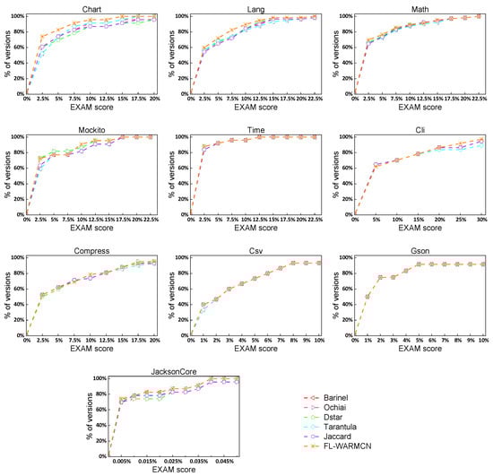 The experimental results of FL-WARMCN and baseline fault location methods on EXAM scores are shown in Figure 4. We can find that FL-WARMCN is significantly better than other methods on Lang, Chart, Math, Mockito, Cli, and JacksonCore datasets.