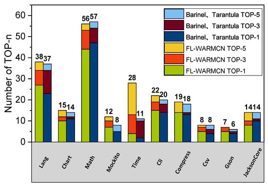 To deeply analyze the performance differences between FL-WARMCN and baseline fault location methods on TOP-1, TOP-3, and TOP-5, we selected the two best suspiciousness in terms of TOP-1, TOP-3, and TOP-5 indicators: Barinel and Tarantula. The results of these two suspiciousness algorithms are completely consistent on the Lang, Chart, Math, Mockito, Time, Cli, Compress, Csv, Gson, and JacksonCore datasets. The comparison of the experimental results is shown in Figure 5. The abscissa represents different datasets, the ordinate shows the value of TOP-n, and different colors represent different types of TOP-n values. We can find that compared with the optimal baseline method, the performance of the FL-WARMCN model is significantly improved on the Time and Mockito datasets, improving by 154.55% and 50%, respectively. In addition, the application of the FL-WARMCN model on Lang, Time, Mockito, Cli, Comparess, Csv, and Gson datasets can enable software debuggers to determine the accurate location of faults faster.