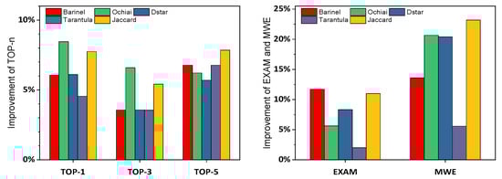 Experimental comparison results of improvements in TOP-n, EXAM, and MWE of Barinel, Ochiai, Dstar, Tarantula, and Jaccard methods after applying FL-WARMCN model.