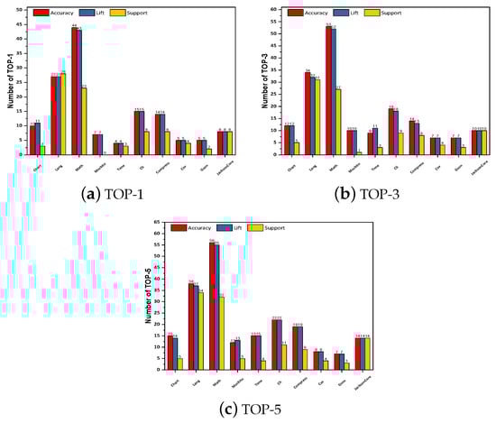 In terms of TOP-n, the FL-WARMCN model uses accuracy, lift, and support as edge weights for TOP-1, Top-3, and TOP-5, as shown in Figure 7. Accuracy outperforms the other two edge weights in TOP-1 on the Math dataset and is consistent with Lift on the Mockito, Time, Cli, Compress, Csv, Gson, and JacksonCore datasets, all of which are superior to Support. In terms of TOP-3, Accuracy is the best edge weight on the Math, Lang, Cli, and Compress datasets, while its performance is on par with Lift on datasets other than Time. For TOP-5, Accuracy is the best edge weight on the Math, Lang, and Chart datasets and only slightly inferior to Lift on the Mockito dataset. Therefore, in the TOP-n metric, Accuracy performs better than Lift while Support performs the worst as the edge weight performance of the FL-WARMCN model.
