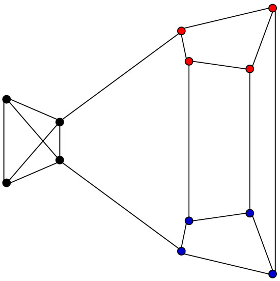 Figure 1 shows an example of a graph with 12 vertices partitioned into three equally-sized groups, with four vertices each. Note that each red and each blue vertex has exactly two in-group adjacent vertices and one adjacent vertex from a different group. Each black vertex, however, has exactly three in-group neighbors and, at most, one adjacent vertex from a different group: the black group is more internally cohesive and isolated. The overall modularity of the graph is , and the group composed of black vertices has a relative contribution to modularity of (). The relative contribution of the other two groups, and , with red and blue vertices, respectively, is quite smaller: ().