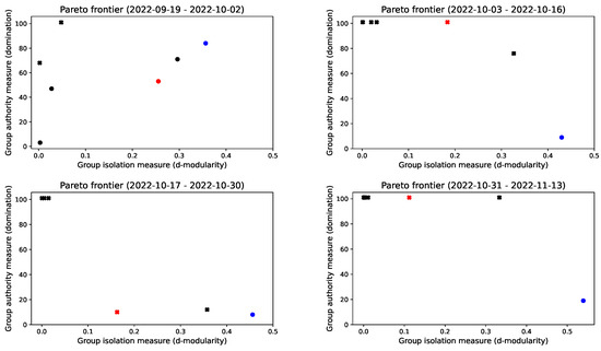 The first dataset, containing data collected before the election’s first round (2 October 2022), did not show one, but several, non-dominated communities. However, the right-leaning group already appeared on the Pareto frontier due to its relatively high in-group loyalty measure value. For the other three datasets, there was only one Pareto optimum. The right-leaning community dominated the rest of the groups, because its in-group isolation increased, while the dominating set sizes, which measure authority strength, decreased simultaneously. The community’s behavior exhibited increasing isolation, and its authorities and leaders showed a growing domination over their audience.
