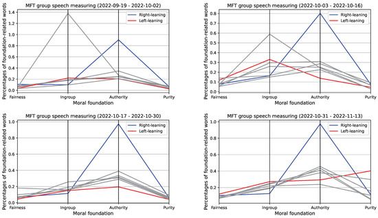 Figure 4 shows the speech-based positioning of online communities for the four analyzed datasets. Looking at this visualization, it can be seen that the blue line greatly surpasses the rest on one axis, showing the extreme relevance of the authority foundation for the right-leaning community when compared to the rest of the groups. This replicates the results obtained using the authority structural feature in the previous section, showing that, in this case, group speech and behavior went hand in hand.