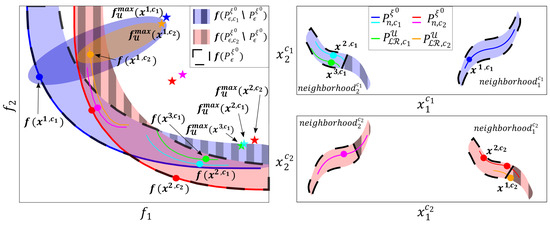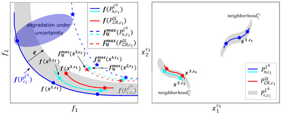 Let us take an example. Suppose you wish to design a control system. Two design objectives are defined: one evaluates the error in the output (), and the other evaluates the control effort (). We will use a design concept and a controller with two decision variables: and . The optimal and nearly optimal controllers with the nominal scenario were obtained using a multi-objective evolutionary algorithm. There were two different neighborhoods where the optimal or nearly optimal controllers were found ( and ). In , there are optimal controllers for . In , the most robust controllers (robust being understood as the controllers that obtain the best ) that were not optimal for were found. Figure 1 shows the sets of (blue and light blue controllers) and (red controllers). In the objective space, these sets are represented in the nominal scenario by (solid lines) and the set of scenarios is represented by (dashed lines).