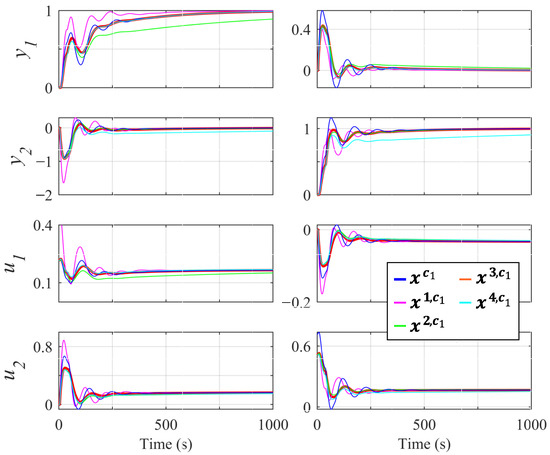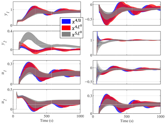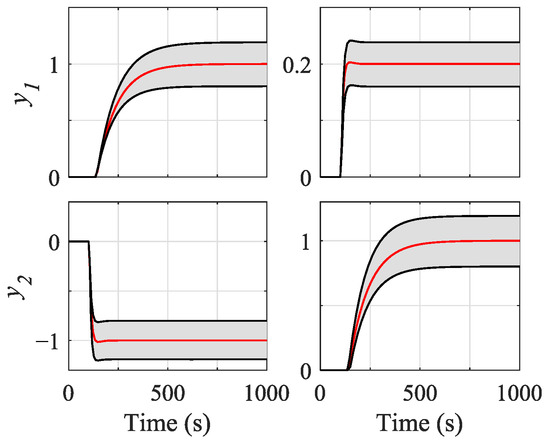 Figure 10 shows the envelope response to the 50 models of controllers , , and for off-diagonal pairings, where is a lightly robust controller, and and belong to set . Controller obtained an envelope similar to . However, in some situations, controller obtained a better response. For example, output for controller had a smaller oscillation than the rest of the controllers. However, it produces a larger oscillation about . For all these reasons, the designer may choose the controller instead of the rest of the controllers. Therefore, the new methodology presented obtains a greater diversity of controllers, thus allowing the designer to decide with a greater number of criteria.
