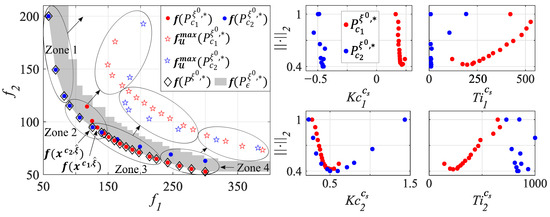 Furthermore, in Figure 8, Zones 1 and 2 are defined with the controllers that have similar robustness. In Zone 1, six controllers are selected: three controllers from set and three controllers from set . In Zone 2, six controllers are selected: three controllers from set and three controllers from set . The parameters of these controllers are seen in Table 2. As can be seen, the three controllers belonging to in each design concept were very similar (, , and in Zone 1; , , and in Zone 2). Set had a controller similar to those controllers ( in Zone 1 and in Zone 2). However, in addition to that, had two significantly different controllers with similar robustness. In Zone 1, controllers and were obtained. In Zone 2, controllers and were obtained. These controllers had a similar robustness and were significantly different from the controllers. This occurred repeatedly along the obtained Pareto front. Therefore, the new methodology presented obtains greater diversity and enables the designer to choose the final controller with better information.