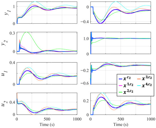 From sets and , the compromised controllers and were selected, respectively. These reference controllers enabled us to perform a sensitivity analysis for the choice of parameters and . To achieve this, we independently varied each parameter of these controllers until significant behavioral differences were achieved. For example, given reference controller , we obtained the following: (1) controller with an increase of over ; (2) controller with a 250 increase over ; (3) controller with an increase of over ; etc. Table 1 shows the new controllers and their performance with the nominal model. Furthermore, Figure 6 (diagonal pairing) and Figure 7 (off-diagonal pairing) show the output and control action of each of these controllers in the two proposed tests. Although the responses may seem poor, it can be verified in works where the same process is used and the same type of controller is tuned (see [30,36]) that the response exhibits similar behavior. As can be seen, all these controllers obtained a significantly different response than the initially selected compromise controllers. Therefore, neighborhood was defined (which was necessary to subsequently obtain set ). Furthermore, based on the results obtained, we defined (which was necessary to obtain sets and ) as the maximum acceptable degradation for the nominal model.