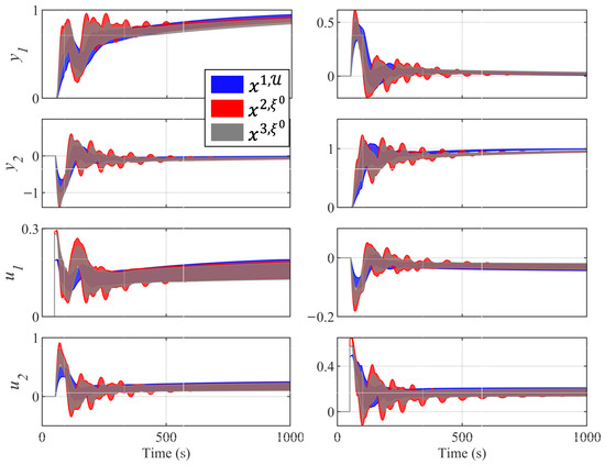where and are the process outputs to be controlled, and and are the process inputs (control actions). The model inputs and outputs were normalized. This system is highly coupled, and the uncertainty was associated with all model delays, gains, and time constants. Therefore, the scenarios were defined by vector as follows: