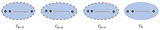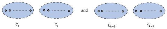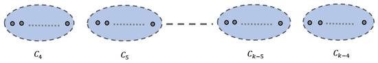 - Through the adjacency method and by Figure 2, we deduce that for each of three consecutive cliques, one vertex of the middle one can be in a dominating set. So the cardinality of , and thus, from the definition of the domination number and the number of sequential cliques, we can obtain .