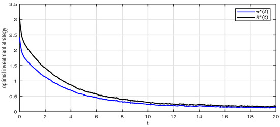 Based on 1000 simulated sample paths for an investment strategy, we depict the average of the optimal investment strategy. Figure 1 reveals the difference between the optimal investment strategy under the stochastic volatility model and the constant volatility model, where the optimal investment strategy corresponds to the original optimization problem with , whereas corresponds to the optimization problem that specifies . Here, we set and . We find that the chosen volatility specification yields optimal portfolios with properties that are consistent with properties of well-known stochastic volatility models. With the increase of time t, the investment strategies and decrease. The optimal investment proportion of risky assets under the stochastic volatility model is higher than that under the constant volatility model, which can be attributed to the stochastic volatility model being able to describe the fluctuation of risky assets in the financial market more accurately than the constant volatility model. Fund managers with more market information will allocate risky assets more actively and thus increase the investment proportion of risky assets.