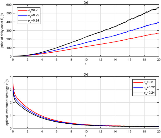 represents the price volatility of risky assets. For the sake of convenience, in Figure 2 and the rest of the figures, we assume . As depicted in Figure 2a, the price fluctuation of the risky asset with a low level is more moderate compared to that with a high level, which aligns with our intuitive expectations. In Figure 2b, we observe that decreases as increases. As increases, the pension fund’s investment in the risky asset has to bear more risk, which reduces the attractiveness of investing in risky assets for the pension fund manager. Consequently, the fund manager prefers to adopt a relatively conservative investment strategy and reduces holdings of risky assets under such circumstances. In addition, as the final date approaches, the fund manager prudently lowers the proportion of assets invested in the risky asset to minimize investment risk, in alignment with the pension fund’s principles of prioritizing safe investments.