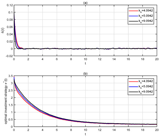 Figure 3 shows the effect of the mean reversion rate of the unobservable factor on . Note that the mean reversion phenomenon is not obvious when (because the initial value of the unobservable factor is equal to its long-term mean). To show the effect of on , we assume in Figure 3a. We find that the larger the , the faster the returns to the long-term mean . In addition, as the prediction error decreases with , implying that the prediction of is more accurate, more information about the Sharpe ratio can be obtained. The manager with more market information prefers to actively allocate assets to the risky asset, which is consistent with the curves shown in Figure 3b.