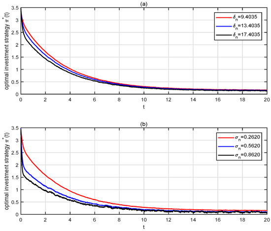 Figure 4 demonstrates the effect of the parameters and on the optimal investment strategy . Here, weights the amount of unobservable information. The larger is, the less information is directly available. Although unobservable information can be predicted by a learning mechanism, there are still prediction errors . The higher the proportion of unobservable factors, the relatively less market information the manager has and therefore the less confidence the manager has in the investment. As shown in Figure 4a, the manager tends to make more conservative and prudent investment decisions, reducing the proportion of assets invested in the risky asset. Figure 4b shows the negative relationship between and . The volatility of the expected return and forecasting error both increase with . Therefore, the fund manager will reduce the amount of assets invested in the risky asset as increases.