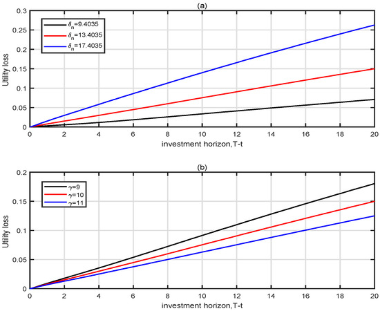 The fund manager who selects an suboptimal strategy will experience a decrease in expected utility, resulting in a loss of utility. The utility loss employing the percentage of the initial wealth loss induced by the suboptimal strategy, as per Larsen and Munk (2012) [32] and Flor and Larsen (2014) [33], entails an expression as follows:
