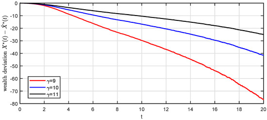 To analyze the impact of the return of premium clause on the amount of pension fund wealth, we denote the fund wealth with and without the clause by and , respectively. represents the deviation of the above-mentioned two kinds of wealth. Figure 7 shows that the amount of fund wealth with the return of premium clause is lower than that without. The return of premium clause of the DC pension plan safeguards the rights of participants who pass away prior to retirement by permitting beneficiaries to withdraw the deceased’s pension contributions. This withdrawal mechanism results in a lower wealth level of pension funds than that without the return of premium clause. In addition, we find that the deviation amplifies over time, which is attributed to the probability of participants’ death increasing over time, leading to an increasing amount of wealth withdrawn from the pension fund. Moreover, Figure 7 depicts the impact of the risk aversion coefficient of the fund manager on fund wealth. The lower the level of is, the less risk averse the fund manager is and the more likely the manager is to implement more aggressive portfolio decisions. Thus, the relatively aggressive ( 9) investment strategy may incur greater wealth deviation.