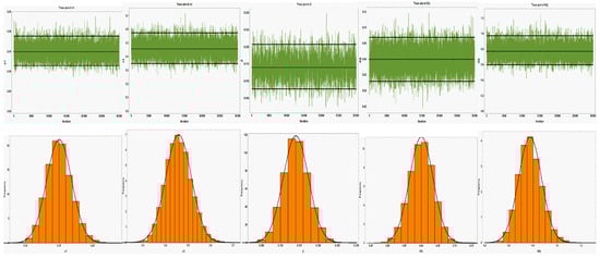 The next step would be to compute the Bayes estimates of , , , and against the SE, LINEX, and GE loss functions using the MCMC samples. Selecting the hyper-parameters in a real dataset while using Bayesian estimating is a very difficult operation since the true value is not known in advance. Hence, we combine the non-informative prior assumptions () with the MCMC approach to build Bayes estimators. The initial assumptions for executing the MCMC algorithm are thought to be the MLEs estimations of , , and . In employing posterior sample points and ignoring the burn-in of the first 5000 times, the Bayes estimates of , , , and are evaluated using the M-H method. A proposed density function that follows a normal distribution may be built in order to use the MCMC approaches, using the variance–covariance matrix and mean equal to the MLEs of the unknown parameters.