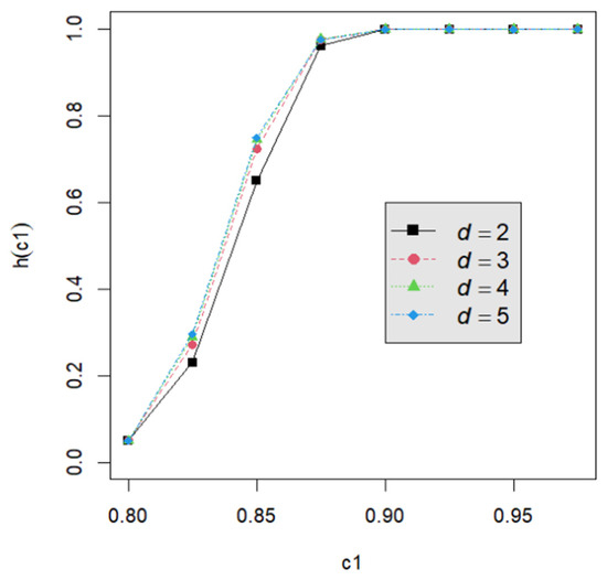The power h(c1) for d = 4 and α = 0.1.