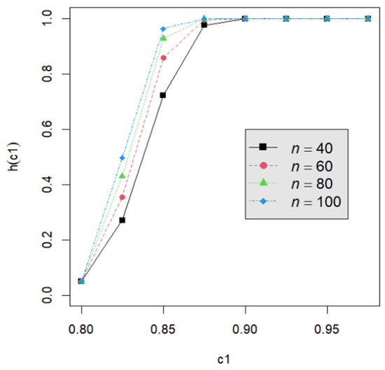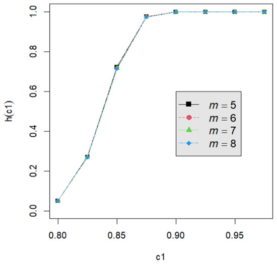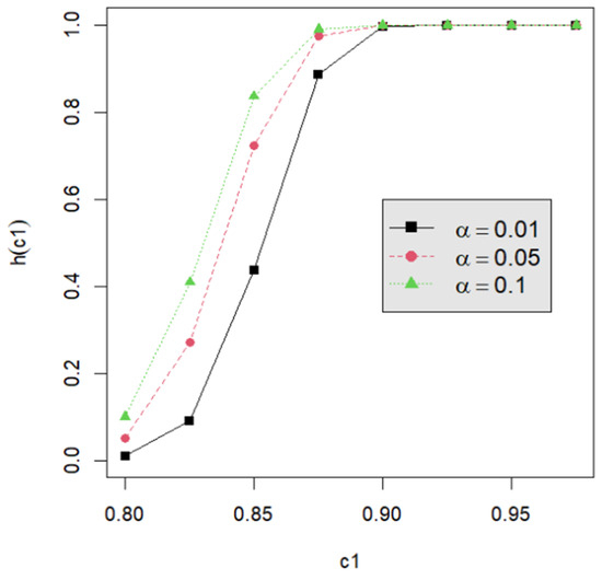 Let us assume that quality engineers want to test vs. with the lower specification limit L = 0.05 and the termination time T = 0.5. The powers h() are calculated by Equation (24) for the proposed testing procedure. They are tabulated for d = 2, 3, 4, 5 with c1 = 0.800, 0.825, 0.850, 0.875, 0.900, 0.925, 0.950; m = 5, 6, 7, 8; n = 40, 60, 80, 120; and p = 0.050, 0.075, 0.100 in Table A2, Table A3, Table A4, Table A5, Table A6, Table A7, Table A8, Table A9 and Table A10. Figure 1, Figure 2, Figure 3, Figure 4 and Figure 5 provide a depiction of the power values for various typical cases. Our observations are as follows: (1) From Figure 1, the power increases with an increase in d under n = 40, m = 5, p = 0.05, and α = 0.05. This behavior is consistent across other combinations of n, m, p, and α. The difference in power for different d decreases when d is greater than 4. (2) From Figure 2, the power increases as n increases, holding d = 3, α = 0.05, m = 5, and p = 0.05 constant. This trend is consistent across other combinations of d, m, p, and α. (3) From Figure 3, the power increases with an increase in m for given d = 3, n = 40, p = 0.05, and α = 0.05. This pattern is also seen with other combinations of d, n, p, and α. (4) From Figure 4, as p increases, the power increases, with d = 3, n = 40, m = 5, and α = 0.05 held fixed. This trend holds for different combinations of d, n, m, and α. (5) From Figure 5, the power increases when α is increased, given d = 3, n = 40, m = 5, and p = 0.05. Similar patterns are observed for various combinations of d, n, m, and p. (6) From Figure 1, Figure 2, Figure 3, Figure 4 and Figure 5, the power increases as the value c1 increases for any combination of d, n, m, p, and α.