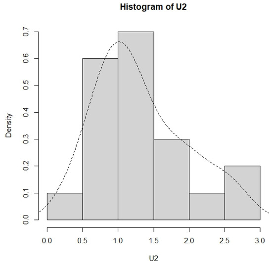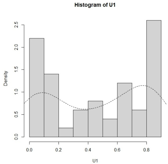For the production of products with two components (d = 2), the lifetime data of the first component are the failure times in Aarset [18]. The data of 50 failure times U1j, j = 1, …, 50, are as follows: 0.001, 0.002, 0.010, 0.010, 0.010, 0.010, 0.010, 0.020, 0.030, 0.060, 0.070, 0.110, 0.120, 0.180, 0.180, 0.180, 0.180, 0.180, 0.210, 0.320, 0.360, 0.400, 0.450, 0.450, 0.470, 0.500, 0.550, 0.600, 0.630, 0.630, 0.670, 0.670, 0.670, 0.670, 0.720, 0.750, 0.790, 0.820, 0.820, 0.830, 0.840, 0.840, 0.840, 0.850, 0.850, 0.850, 0.850, 0.850, 0.860, and 0.860. The histogram and the density curve for this dataset are displayed in Figure 6.