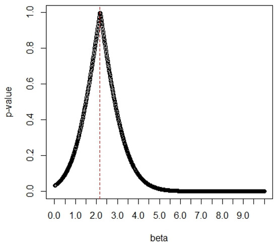 The p-values of the G test based on the Gini statistic (see Gail and Gastwirth [19]) are a function of the values of δ1, and they are displayed in Figure 7. The Gini statistic is obtained as where and j = 1, …, 25. From Figure 7, we can find the maximum p-value of 0.9966 at the value of δ1 = 2.17. The large p-value indicates that the data fit the Chen distribution very well, so the value of δ1 is determined as δ1 = 2.17.