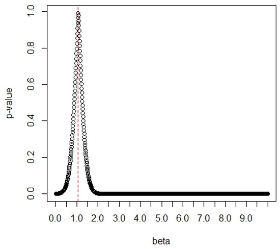 Similarly, we display the p-values of the G test versus the values of δ2 in Figure 9. In Figure 9, the maximum p-value of 0.9925 occurs at the value of δ2 = 1.07. The large p-value indicates the good fit of the data to the Chen distribution. Therefore, the value of δ2 is obtained as δ2 = 1.07.