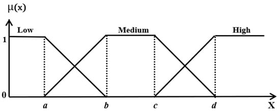 Fuzzy logic, as a soft computing technique, provides a powerful approach for handling uncertainty and approximate reasoning in a flexible and reliable fashion. It is more accurate in modeling uncertainty compared with traditional methods [7,8]. Fuzzy set theory represents a generalization of crisp set theory, and allows partial membership. While an element either belongs fully to a crisp set or does not belong to it at all, an element can belong to a fuzzy set with a membership value between 0 and 1. Many membership functions allow a flexible definition of fuzzy sets. Some of these membership functions are triangular, trapezoidal, bill-shaped, and sigmoid functions. The trapezoidal membership function is common and flexibly defines a fuzzy set. It can be modified to be a left- or right-shouldered membership function. Figure 1 shows the use of trapezoidal FMF to define three linguistic terms—“Low”, “Medium”, and “High”—over the universe of discourse X, which are defined as right-shouldered, ordinary, and left-shouldered trapezoidal FMF, respectively.