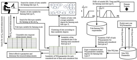 Fishing is one of the main pillars of human food security. Humans get 14% of their animal protein from fish. In 2020, global fish production reached around 178 million tons, which was the highest worldwide annual rate of production. Accordingly, fish farming has received a lot of attention in recent times due to its importance in fish production. Egypt represents one of the developing countries that produced around 1.59 million tons of fish. Fish farming accounts for more than 50% of the overall production of fisheries and aquaculture [1]. Human population in Egypt is growing rapidly. As a result, the demand from middle- and low-income peoples for fish is significantly increasing as it represents a cheaper alternative to other more expensive food items rich in protein like meat and chicken. As a result, farming some cheap types of fish, like tilapia and catfish, is more suitable and common in Egypt. The fish farming process in fresh water has less cost and is more sustainable than that in the seas or oceans [2]. Commonly, modeling the evaluation and selection process of the most suitable sites for fish farming is one of the hardest and most challenging management tasks. Water quality (WQ) mainly depends on measuring physical, chemical, and biological properties of water. Spatial water sites differ according to their WQ parameters’ states. Hence, it is required to select the best WQ sites before starting fish farming, or to adjust abnormal parameters to make the site suitable for farming a specific type of fish. Generally, almost all types of fish need appropriate degrees of WQ parameters, particularly the following parameters: dissolved oxygen (DO), acidity (PH), and temperature (Temp) [3,4]. DO is the amount of dissolved oxygen gas present in a water site measured in mg/L. Very low levels of DO catastrophically harm fish life and affect the WQ itself [5]. Naturally, DO should not be less than 5 mg/L for most fish types. On the other hand, the potential of hydrogen (PH) parameter describes the acidity or alkalinity of water. The value of PH represents the instantaneous hydrogen that affects the biological and chemical properties of water. Most fish require water with PH between 6 and 9 [6]. Usually, values of PH lower than 4.8 or higher than 9.2 harm most fish types. In addition, the temperature of a water site greatly affects fish breading and health. A very low or very high temperature at a water site causes diseases, mortality, and loss of fish weight. Most fish types have various suitable fuzzy ranges of WQ parameter values, rather than being precise crisp values. Therefore, there is a need to model the requirements of fish types for farming at a water site in a flexible manner [6].