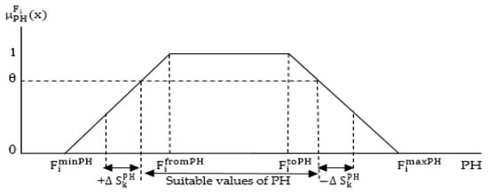 - Any PH value belonging to [,) or (] has a partial suitability degree in [0, 1) for farming fish type , which is computed using Equation (1).