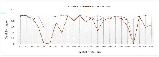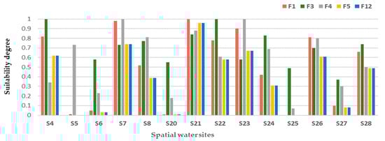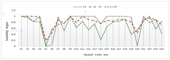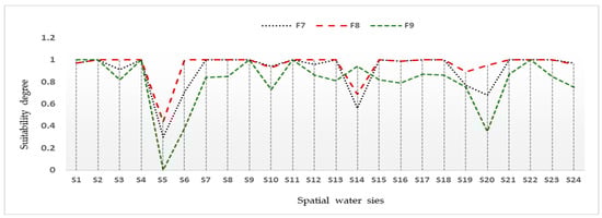 Figure 8 shows the suitability degrees of the considered water sites for farming fish types F1, F2, and F3. On the other hand, Figure 9 shows the suitability degrees for farming fish types F7, F8, and F9 at the considered water sites along the Nile River. In addition, Figure 10 shows the suitability degree of sites for farming fish types F11, F12, and F13.