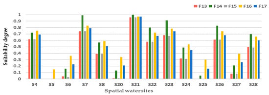 Therefore, the greater the suitability degree of a freshwater site for farming a specific fish type, the higher the production and outcome rates, and vice versa. Thus, the result of applying the proposed approach greatly facilitates managing and planning fish farming along the considered Nile River sites. This approach ranks the resulted spatial clusters of water sites with respect to their average suitability of farming each considered fish type. Hence, it enables deciding which type of fish to farm in which water sites based on their computed suitability degrees. With respect to Figure 11, which shows a subset of the considered set of sites, we conclude that the more suitable sites for farming fish type F3 (Anguilla) include S4 and S22. In addition, sites S7 and S23 are more suitable sites for farming fish type F4 (Fresh Water Sardines). As shown in Figure 12, the more suitable sites for farming fish type F14 (Tilabia Zillii) are S7 (Esna), S21 (Giza) and S23 (Kafrzayat). Although fish types (F14:F17) have the same main category, namely Tilabia fish, they have different tolerance degrees with variations in water quality. It can be noted that F14 has the highest suitability in most sites compared with the other types (F15:F17) of Tilabia fish. Accordingly, it is more appropriate to farm Tilabia Zillii rather than other Tilabia types in these freshwater sites. In addition, it can be noted that the sites S5 (Kom Ombo), S6 (Edfu), S20 (Helwan), S24 (Desouk), S25 (Banha), and S27 (Mansura) are unsuitable sites for farming not only “Tilabia Zillii”, but also most fish types. Some of these sites suffer from sewage waste and/or factories wastes [35]. These water sites are located alongside industrial cities occupied by factories, such as cement factories at site S20 (Helwan) and a sugar factory at S5 (Kom Ombo), which have huge quantities of wastewater. Some studies proved the negative effect of such wastewater on the quality of water resources near to them [14,35]. This wastewater greatly affects the water quality and causes pollution, at least to some extent. These effects pass into the consequent sites following the polluted site from south to north, which is the natural direction of the water flow.