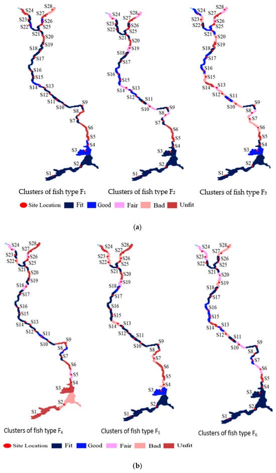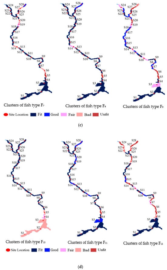 Resulted suitability-based clusters of the considered water sites spread along the Nile River (a) with respect to the fish types F1–F3, (b) with respect to fish types F4–F6, (c) with respect to the fish types F7–F9, and (d) with respect to the fish types F10–F12.