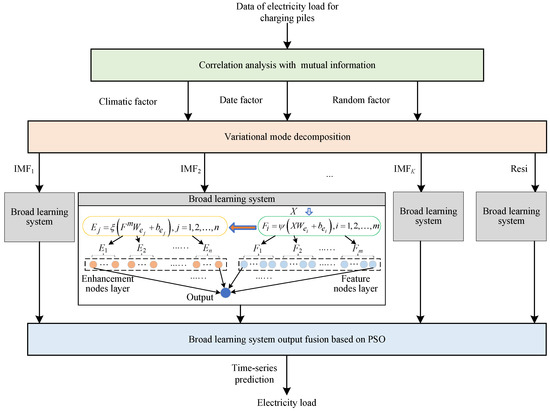 This paper introduces a new electricity load time-series prediction model based on BLS, with the goal of addressing issues related to redundant, periodic, and stochastic electricity load data, as well as reducing the time spent training deep neural networks as seen in previous research. Initially, the data correlation analysis method is employed to identify the primary factors that have a direct impact on the electricity load. Then, the variational modal decomposition [17] is used to obtain the data under different modes; and the BLS-based electricity load prediction models are established for different modes, respectively. Finally, a multi-model fusion strategy based on particle swarm optimization (PSO) [18,19] is proposed in order to fuse the prediction models in different modes. At the same time, experiments are being carried out using actual electricity load data to confirm the efficacy of the proposed method.