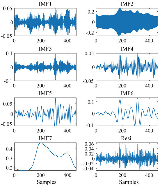 where and are, respectively, the eigenmode function obtained from the decomposition of electricity load data and the corresponding center frequency, is the original signal, is the impulse function, and K is the artificially set decomposition quantity.