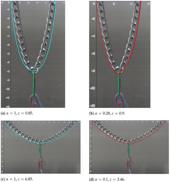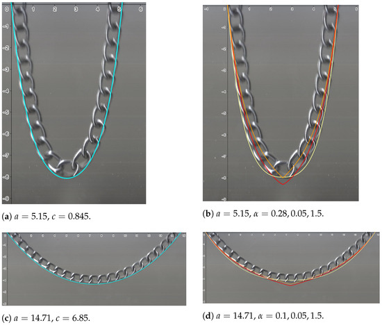 Note that the function , given in (15), depends on the parameter c, which in turn depends on the linear density of the chain. The criterion we used to determine the value of c is the one that minimizes the error in approximating to the curve determined via the chain, taking a fixed value of the index . In Figure 2a,c, the classical catenary curve is shown in blue. As we can observe from Table 1, when is 1, the errors are smaller compared to the fractional case, with curves in red (, ), yellow (, ), and orange (, ) when and in red (, ), yellow (, ), and orange (, ) when ; see Figure 2b,d. Indeed, in the classical case, the error is cm when cm and cm when cm, considerably lower than in the fractional case; see Table 1. The errors in the figures were measured using Digimizer 2024, an image analysis software package that allows precise manual measurements (see [14]). In this way, in Figure 2b,d, we see that the fractional curves (i.e., ) deviate from the curve determined according to the chain. In other words, the fractional solution (15) does not model the curve produced via the chain.