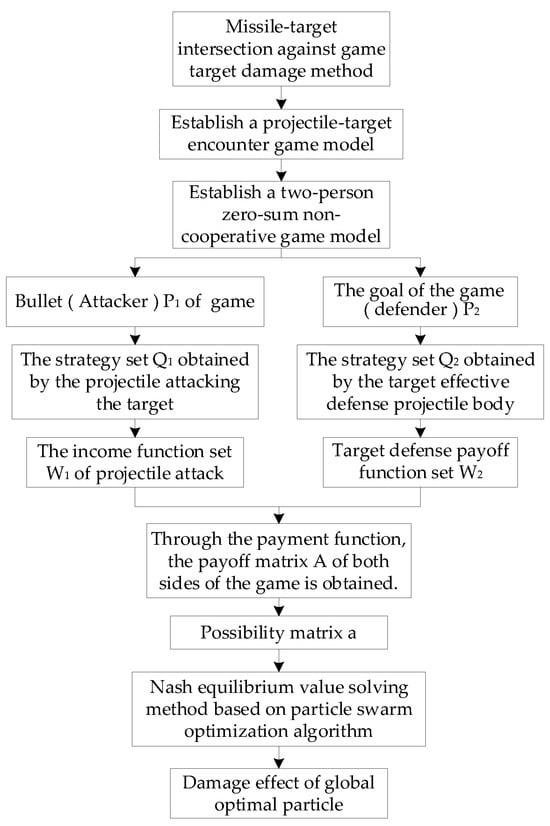 For the calculation of target damage assessment, the U.S. military took the lead in applying Bayesian network theory to the field of target damage assessment and proposed a Bayesian network decision model for target damage assessment [9]. Fu et al. [10] summarized the general methods and key technologies of related research by establishing the research content system framework of quantitative evaluation of damage effectiveness and analyzing the four aspects of target vulnerability analysis and calculation, warhead power analysis and calculation, damage effect test and calculation, and comprehensive evaluation of damage effectiveness. Taking the penetration warhead against building targets as an example, the quantitative evaluation model of missile damage effectiveness is given. Wang et al. [11] established the evaluation model of surface target damage effect under given parameters by Monte Carlo method. In order to evaluate the uncertainty of the problem, this paper used the reliability distribution function. The evaluation results show that the uncertainty of the damage effect is high. The simulation results show that the unascertained range of the effective damage rate of the surface target is significantly reduced. This study can effectively guide the evaluation of the damage effect and reduce the uncertainty. Yu et al. [12] used the plane triangular element method to describe the surface of the component and calculated the target vulnerable area and damage probability. Li et al. [13] proposed a method for evaluating the damage power of blasting ammunition hitting targets in actual combat under the condition of damage conditions, determined the damage efficiency of blasting ammunition targets, established different damage law models, and obtained the damage law model of fragment group to the vulnerable parts of armored vehicles, and completed the evaluation of the damage power of blasting ammunition hitting targets. In order to accurately evaluate the damaging effect of prefabricated fragments on human targets, Fu et al. [14] numerically simulated the scattering process of the fragment field and used Matlab programming to extract fragment-related information to study the damaging effect of prefabricated fragments on two human postures. The results show that on the battlefield, the squatting posture of combatants can reduce the probability of being hit by fragments, reduce the probability of disability of combatants, and reduce the damage area to a certain extent. The other authors [15,16,17] preliminarily gave the damage evaluation method of static explosion target around the modeling of warhead and target, from the initial interaction of ground projectile and target to the damage state of components, and then to the measurement of target engineering performance and target combat performance. At present, there are few studies on target damage in the intersection between projectile and target confrontation, and target damage under the confrontation system is an important manifestation of the current war. Based on the fact that the hit and defense game damage of projectile and target intersection is regarded as a two-person zero-sum non-cooperative game, this paper regards projectile and target as each other’s hitter and defender, establishes the target damage game model according to the game confrontation theory, and forms the theoretical method formed by the target damage mechanism under different game confrontation strategies. Therefore, this paper focuses on solving the Nash equilibrium solution of the game target damage model.