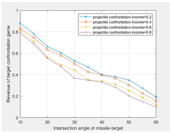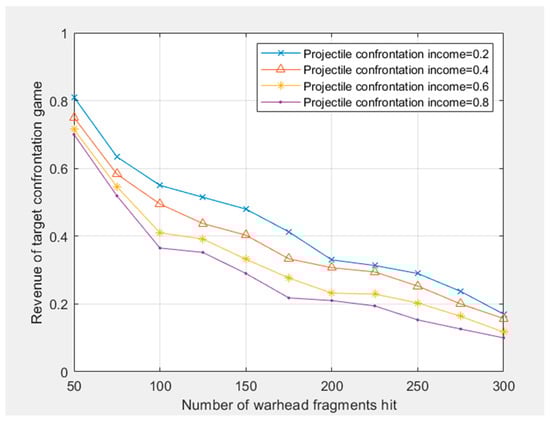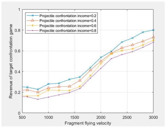 For the curve change of Figure 5, the graph is formed under the condition of a certain income strategy set of both the projectile and the target. From the theoretical model of the game mixed strategy of the target damage of the projectile–target encounter, it can be found that different projectile–target encounter velocities have different effects on the damage effect. Although the damage income of the target confrontation game is closely related to the velocities of the fragment, it is not a linear relationship, especially since the fragment has a certain quality. Because the fragment has the factor of gravity acceleration, at the same distance between the projectile and the target, the velocities are low, and the probability of hitting the target will also become low. Because the number of fragments and the quality of the fragments of the same projectile are different, some fragments may not form a rendezvous with the target under the condition of low velocities, resulting in the target damage effect is not obvious. As the velocities of the fragment increase, the probability of hitting the target also increases for the same fragment. Therefore, from the distribution of the fragment velocities of 1000–2800 m/s, the target damage effect is gradually increasing.