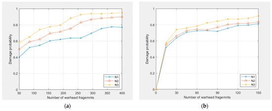 It can be seen from Figure 7 and Figure 8 that in the three cabins, when the minimum kinetic energy E of the fragment penetrating the projectile is satisfied, the damage probability of the cabin increases with the increase in the number of fragments hitting the cabin. On the other hand, the smaller the mean square error of the fragment distribution, the greater the damage probability of the cabin.
