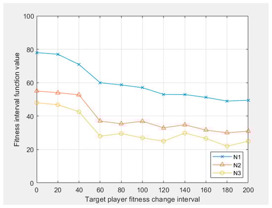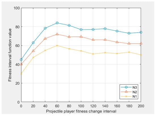 Using the particle swarm optimization algorithm and the possibility formula of the interval, the change interval of the projectile fitness value is obtained, as shown in Figure 9. The change interval of the target fitness value is obtained, as shown in Figure 10.