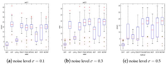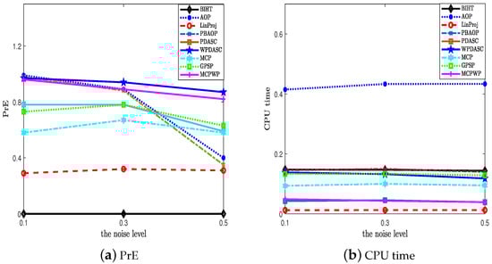 In this test, we try to verify the superiority of our method in comparison with other methods with respect to SNR, the exact probability (PrE(%)), and average computational time (CPU time (s)). The benchmark methods consist of BIHT [], AOP [], PBAOP [], LinProj [,], PDASC [], MCP [], WPDASC [], and []. Although GPSP is an effective method to improve sparsity in synthesis experiments, GPSP needs the two priors of sparsity. And the first four algorithms and MCP require the prior knowledge of sparsity. In addition, the sign flip rate is specified in AOP and PBAOP. Our method, PDASC, and WPDASC do not need priors. The performance is illustrated in Figure 2 and Figure 3 through the three indexes SNR, PrE, and CPU time when the experiments are conducted at various sparsity level settings. Figure 2 shows that MCPWP and WPDASC exhibit superior performance, while GPSP, MCP, and BIHT are more likely to fail as the sparsity increases. In Figure 3a, MCPWP demonstrates a higher exact recovery probability compared to all other methods except for WPDASC. Meanwhile, it is evident that MCPWP requires less CPU time than WPDASC from Figure 3b. These findings highlight that our method MCPWP is an optimal choice in terms of both performance metrics here. Then, the performance of different methods on the various noise levels with others’ fixed is depicted in Figure 4 and Figure 5. As is plotted, MCPWP generally exhibits a higher SNR than other methods across most scenarios. Notably, for the three noise levels, MCPWP demonstrates the highest SNR, which reveals the robustness of the proposed method. When the sign flip rate becomes larger, our method has a higher SNR and less CPU time, as illustrated in Figure 6 and Figure 7. In addition, with high noise and a high sign flip rate , MCPWP has a higher SNR than the benchmark methods. Additionally, as the sparsity k increases, MCPWP surpasses the other approaches in CPU time except for LinProj (due to its lower computational time as a convex approach). Thus, the above experiments demonstrate that MCPWP is robust against noise, sign flips, and sparsity level, and also outperforms other methods. More higher-dimensional experiments are reported in Table 2. By comparison with other methods, our model is superior.