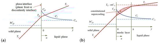 A scheme of directional crystallization with a planar front or discontinuity interface (a) and a region of constitutional supercooling (mushy layer) (b). The solid phase solidifies with a velocity u along the spatial axis y whose origin is at the liquid–solid interface (a) and the mushy layer–solid phase interface (b). The mushy layer of thickness h arises as a result of constitutional supercooling (b).